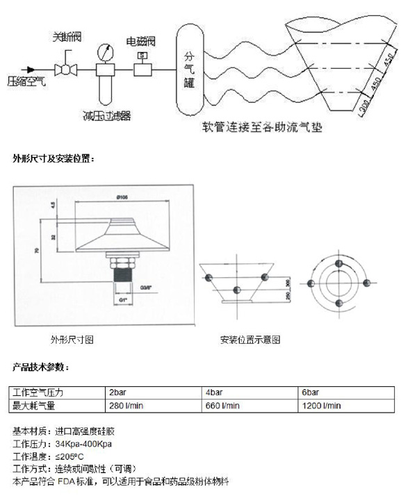 助流气碟采用了耐磨的硅胶材料,在工作时可以同时产生吹气、振动两种动作,压缩空气沿筒仓壁向四周喷出,而且由于空气压力不断变化,气碟边缘会产生高频振动.这些都是有效促进料仓内粉体、颗粒物料向下流动。建议间歇性工作。注:工作温度-30℃< 120℃