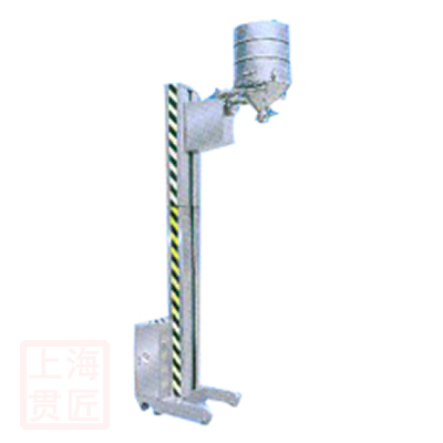 该机主要由底盘、立柱、提升系统和翻转系统等组成。工作时先将物料放入料桶,再启动提升按钮,将料仓提升到所需高度,然后启动翻转按钮,料仓即可翻转180度,旋转立柱与加料设备密闭对接,进行加料操作。